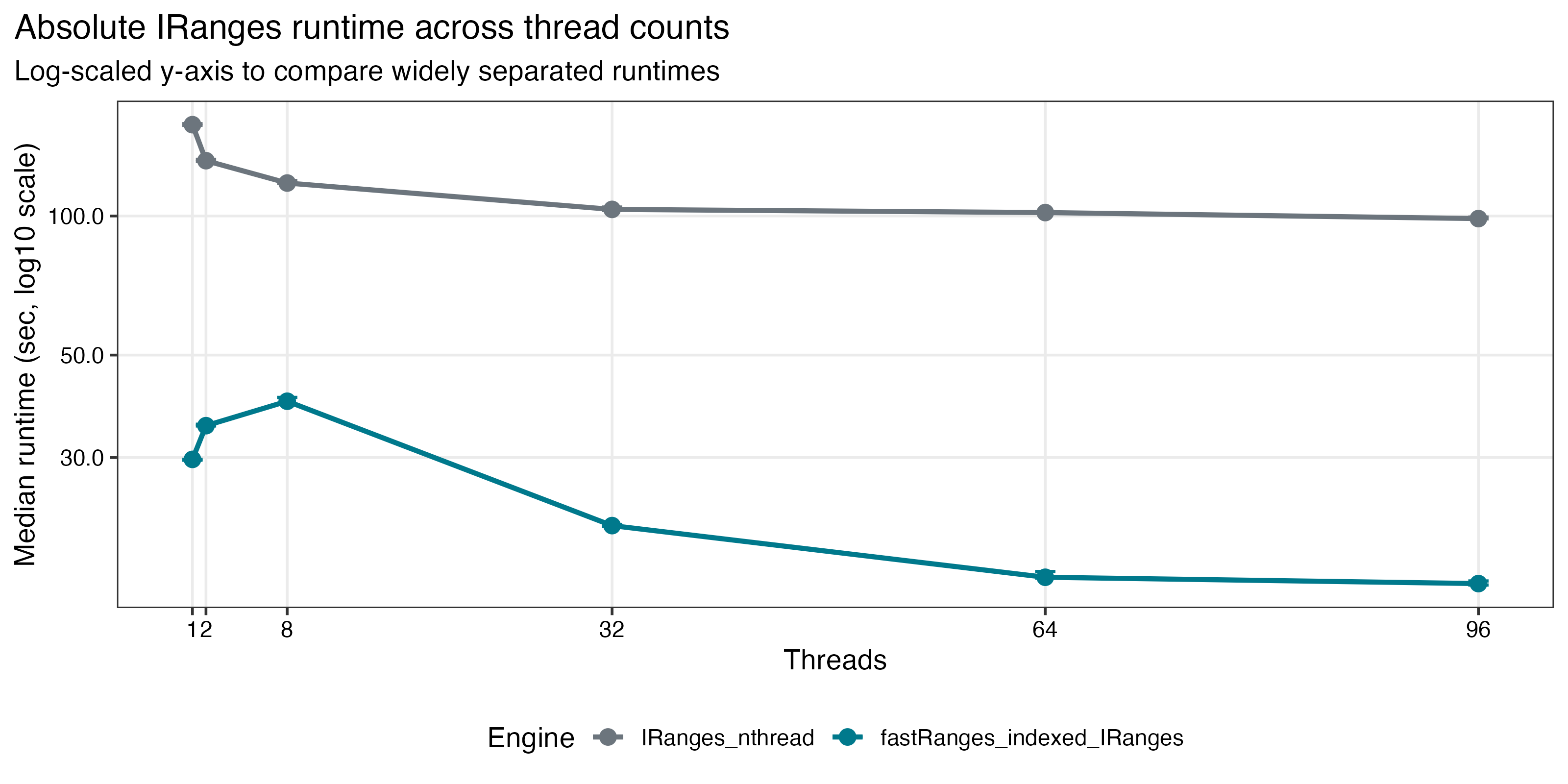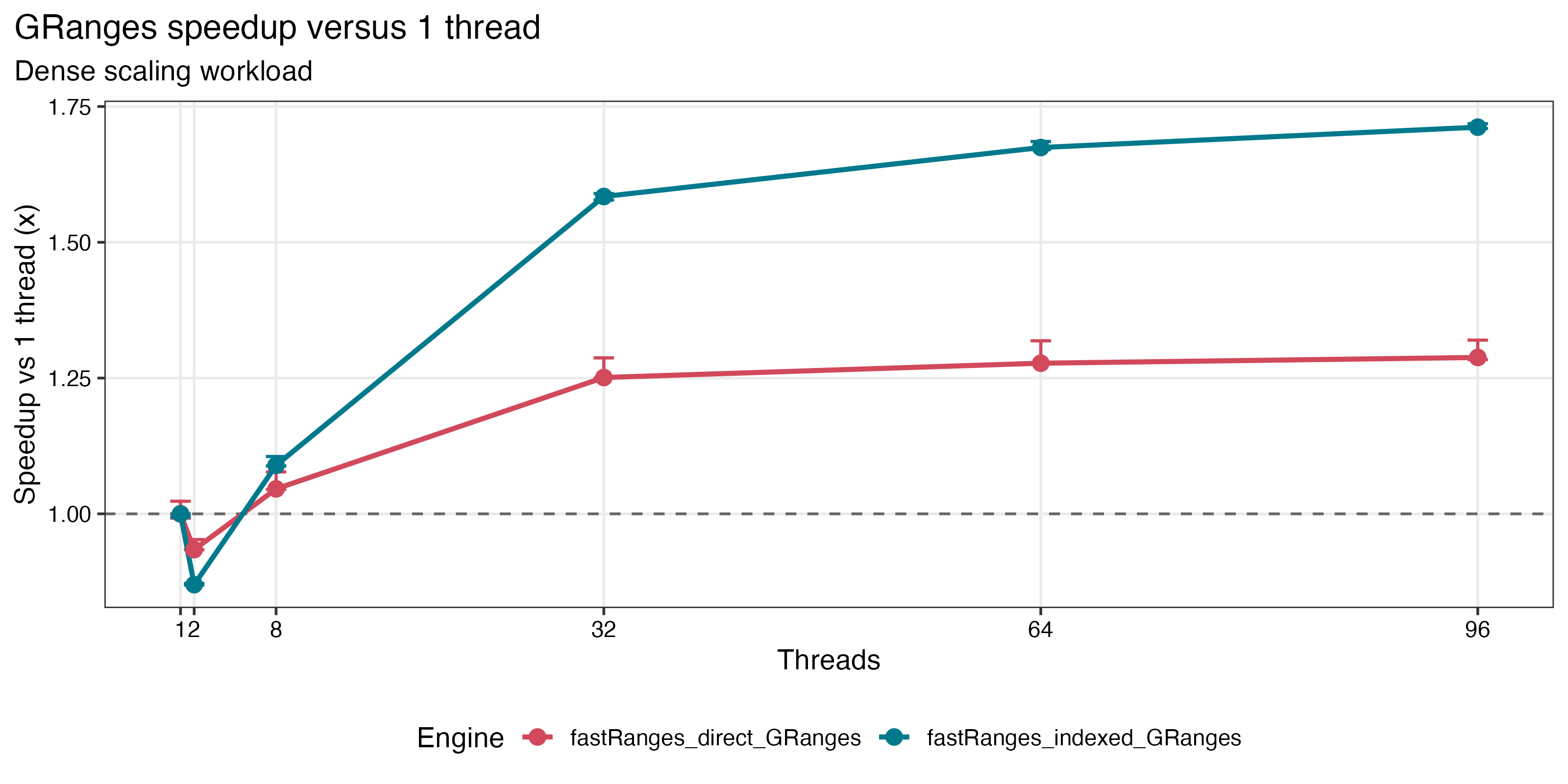 fastRanges is a multithreaded interval engine for IRanges and GRanges. It keeps Bioconductor-style overlap semantics and familiar argument grammar while targeting the workloads that usually dominate runtime in genomics: large findOverlaps() jobs, repeated query batches against one subject, and overlap-derived summaries such as counts, joins, and aggregation.