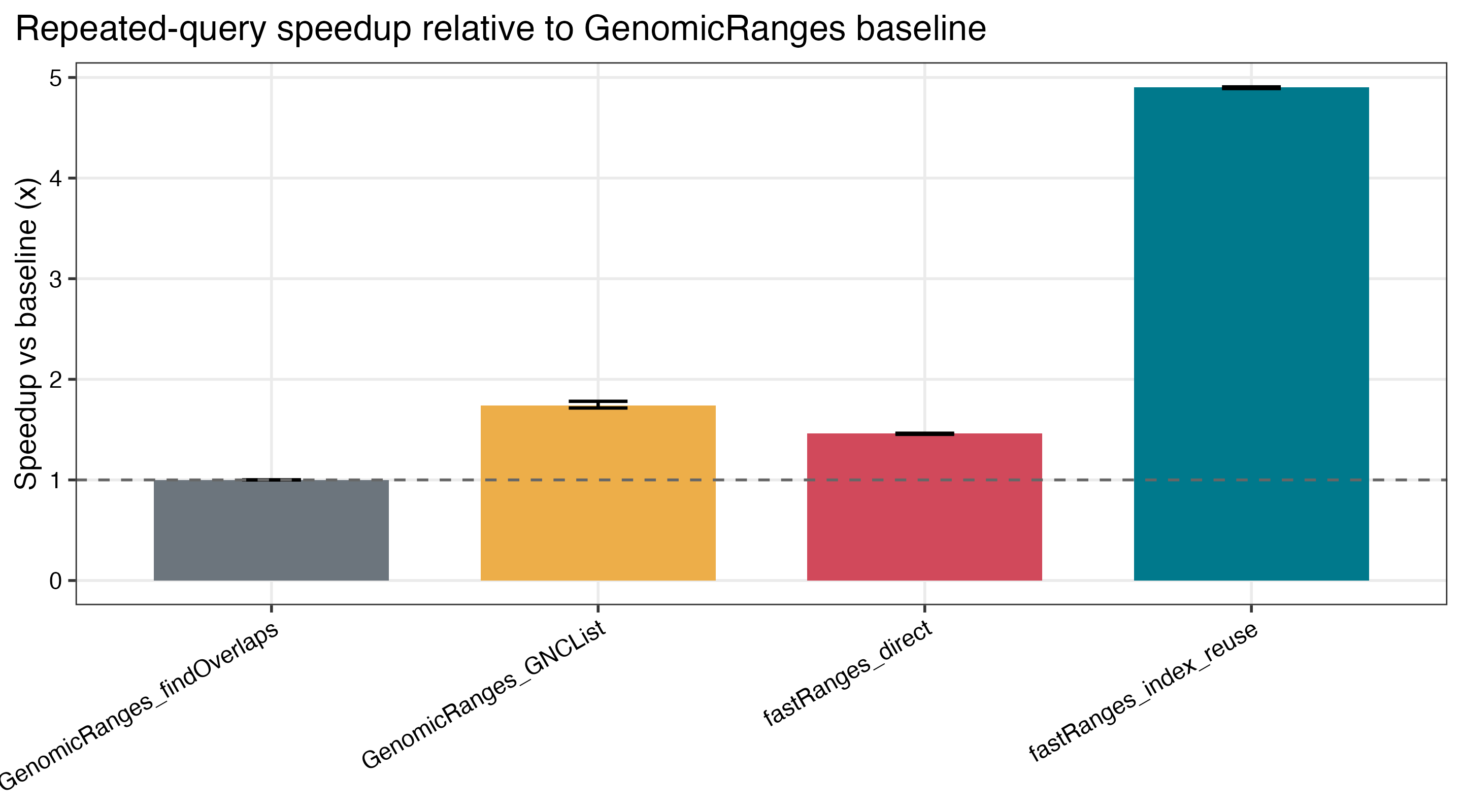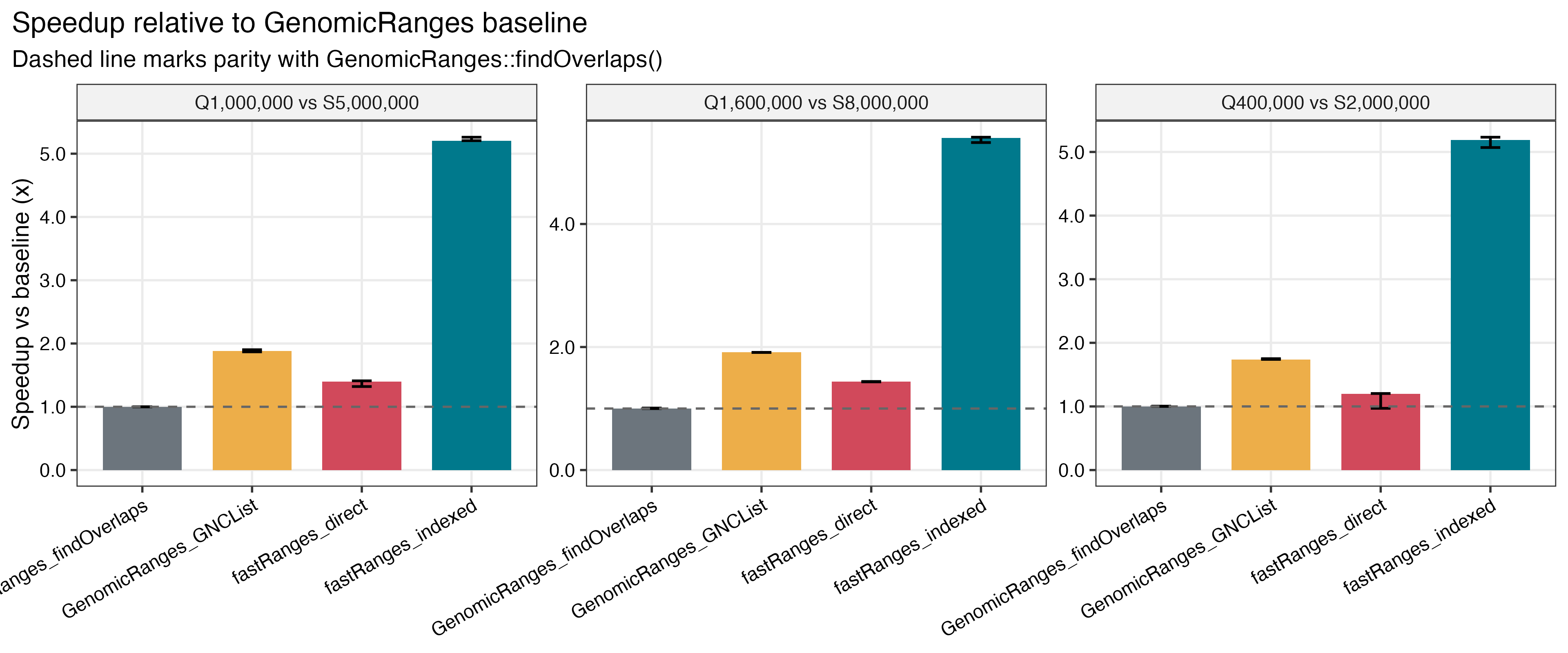 5.19xto5.40xGRangesspeedup for indexedfastRangesversusGenomicRanges::findOverlaps() - about